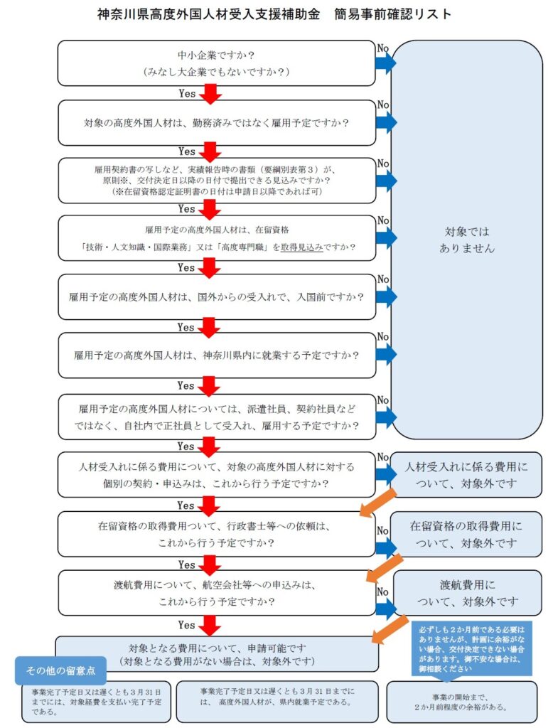 神奈川県では、専門人材不足に悩む中小企業に対し、専門的・技術的分野の外国人材受入を促進するため、海外から中小企業が高度外国人材(※)を採用する際の初期コストを補助するため「神奈川県高度外国人材受入支援補助金」を公募しています。公募申請受付は令和7年6月11日~令和8年2月13日までとなっており、まもなく公募申請期間終了となります。当事務所でも申請手続きをサポートさせていただいておりますが、12月に入ってからのお問い合わせが非常に多い補助金になります。公募申請可否に関しましては、下記のチェック表を参照ください。